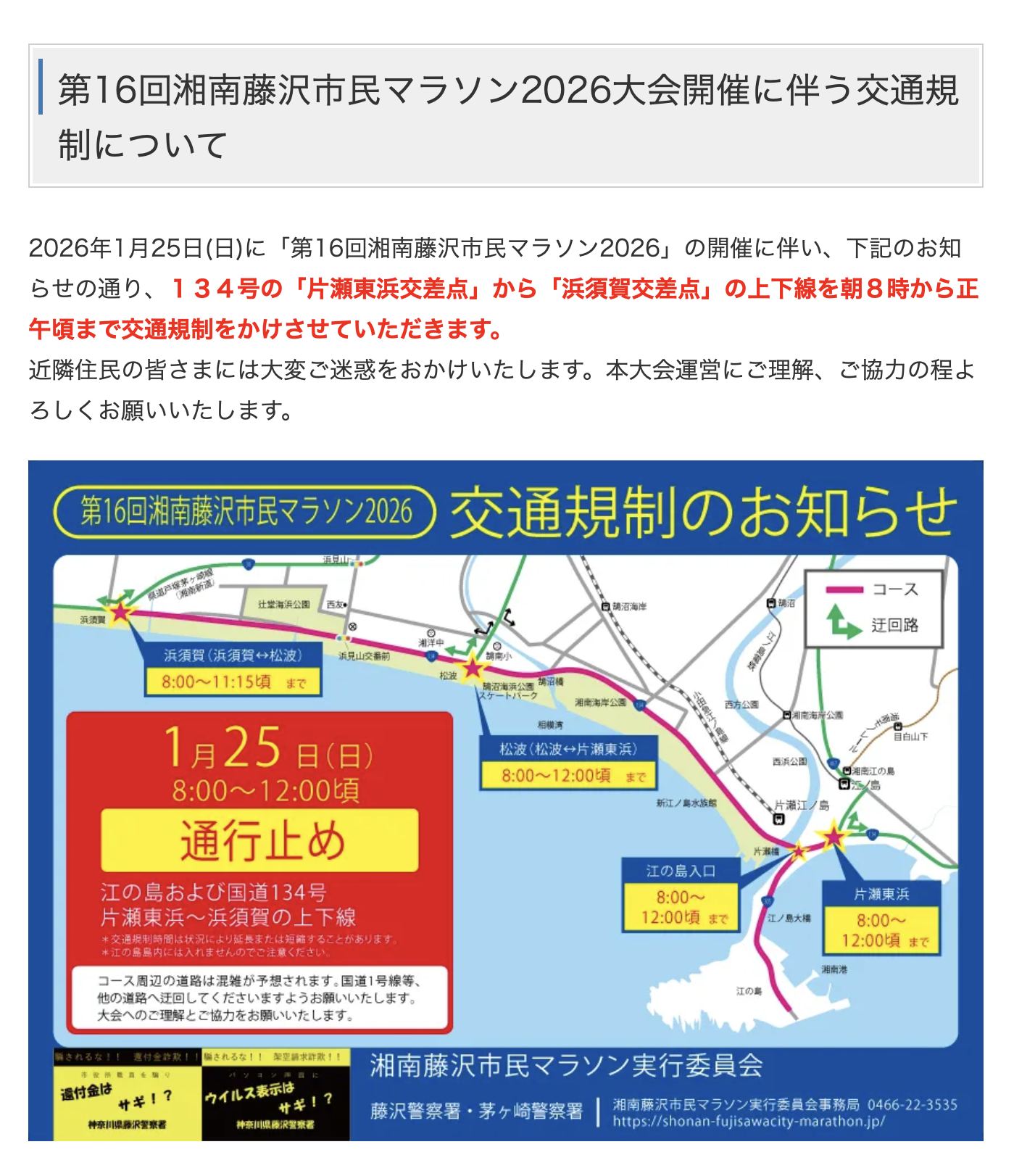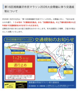 いつもご利用いただきありがとうございます。 1/25(日)に湘南藤沢市民マラソンが行われます。 それに伴い134号の「片瀬東浜交差点」から「浜須賀交差点」の上下線が朝8時から正午頃まで交通規制となります。 お車でお越しの際はご注意ください。